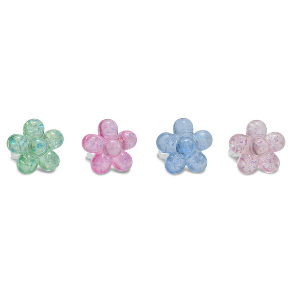 Este set de 4 anillos de acrílico viene en una caja de presentación. Perfecto para complementar cualquier outfit y añadir un toque de estilo a tu look. ¡Haz una declaración de moda con estos anillos florales!