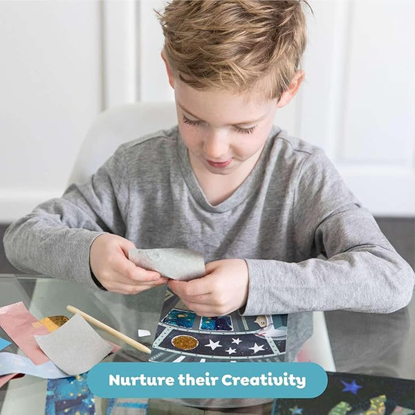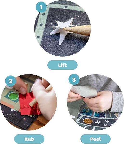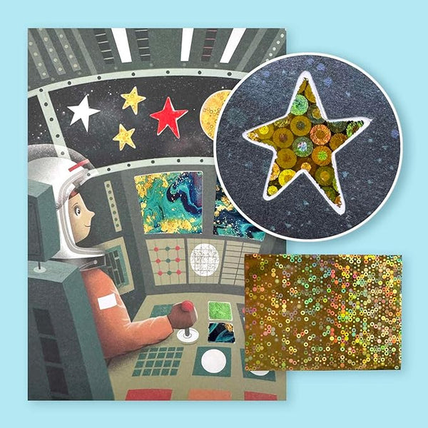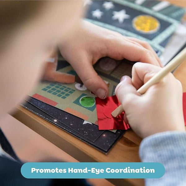 Embárcate en una aventura intergaláctica con FOIL ART SPACE ADVENTURES, un kit creativo que incluye 5 tarjetas de arte a todo color con secciones adhesivas para revelar y decorar con brillo holográfico. Añade destellos únicos usando 24 hojas de aluminio en 6 colores y la herramienta elevadora de madera incluida. Perfecto para estimular la imaginación y habilidades artísticas de los niños, este set es un regalo ideal para cumpleaños o cualquier ocasión especial. Las instrucciones guían el proceso para crear escenas espaciales vibrantes y llenas de vida.