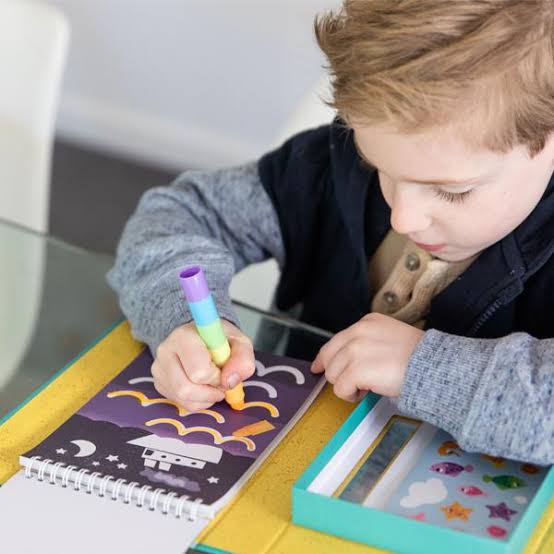 CADA JUEGO INCLUYE: 6 crayones de seda de neón apilables (giro) Libro de actividades de 36 páginas. 5 hojas de pegatinas de colores caja de almacenaje