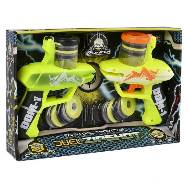 Echa un vistazo al Zip Shot del duelo de dominación del disco de Lanard! ¡Ambos lanzadores de discos de espuma disparan a largas distancias! Viene con 2 por caja y discos de espuma para cada uno.