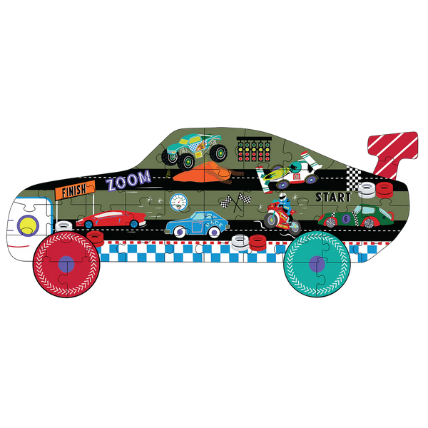 ¡Pon en marcha el juego y acelera con este divertido rompecabezas Cars de 40 piezas! Dentro de la caja reutilizable, encontrarás fantásticas piezas que forman un rompecabezas en forma de auto con una pista de carreras, línea de meta, autos, motocicletas y ¡hasta un camión monstruo! Perfecto para los amantes de los autos, este rompecabezas de 40 piezas mejora la resolución de problemas, la coordinación mano/ojo y la memoria. ¡Empieza la diversión ahora! BENEFICIOS ECOLÓGICOS: Impreso con tintas de soya Hecho con materiales reciclados Completamente reciclable FSC recomendado ¡Apoya el medio ambiente mientras juegas!