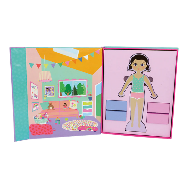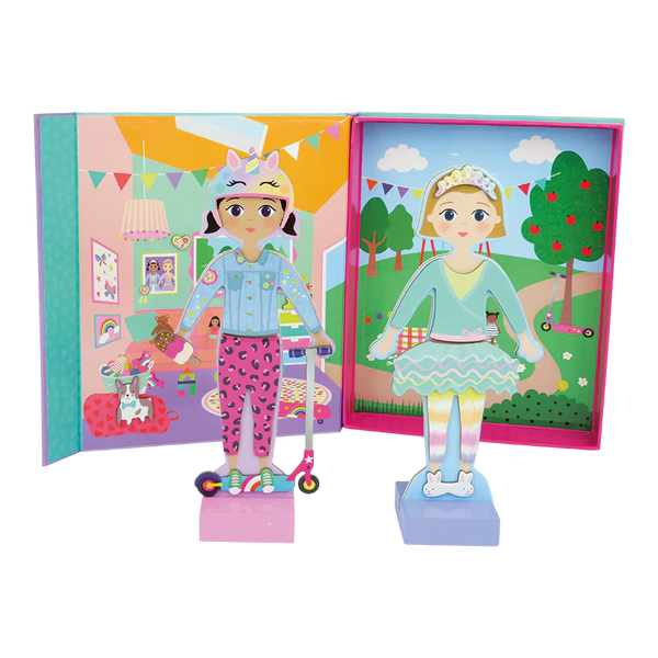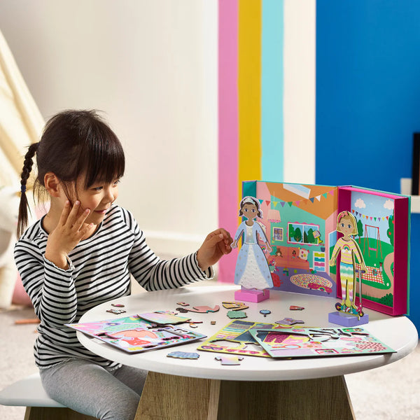El Magnetic Dress Up Best Friends Set permite a los niños crear infinitas combinaciones de vestimenta y juego con más de 70 piezas magnéticas. Incluye 2 figuras magnéticas con soporte de madera, representando a dos inseparables amigas listas para jugar y crear sus propias historias.